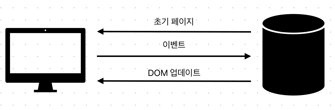 - 그리고 클라이언트는 서버로부터 받은 변경사항으로 UI를 업데이트 하는데 이때 전체 페이지를 로드하는게 아니라 바뀐 DOM 만 바꿔치기 합니다.