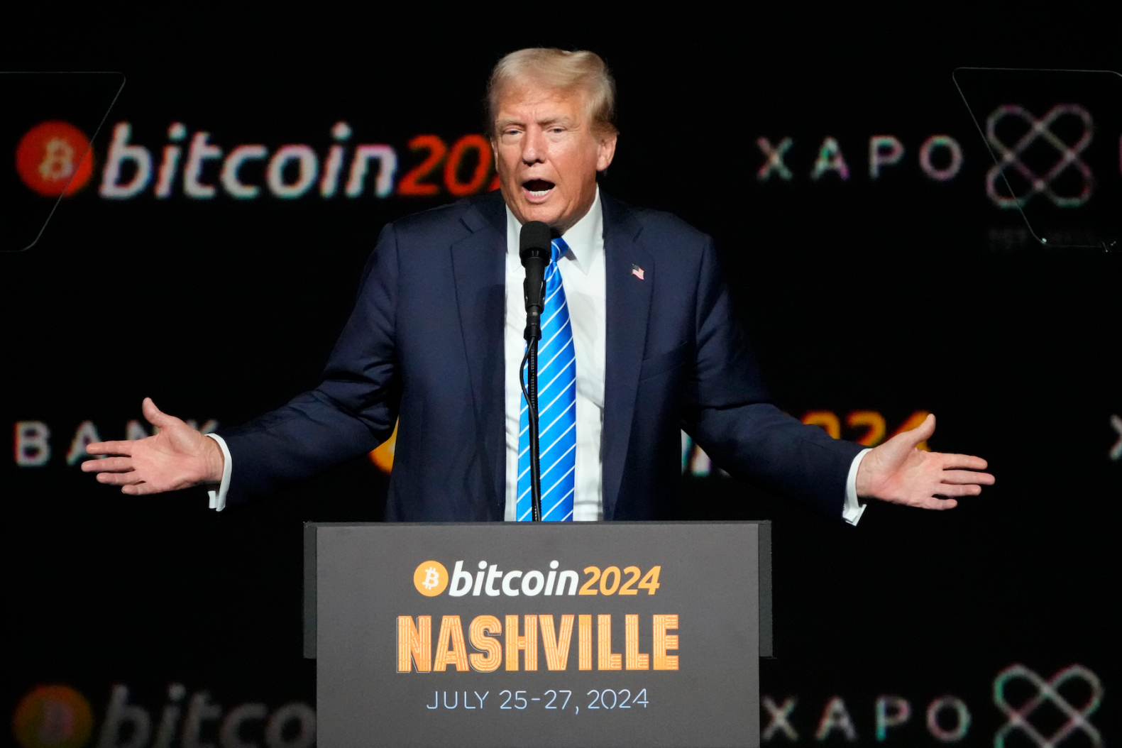 현지시간 27일, 테네시주 내슈빌에서 개최된 '비트코인 2024 컨퍼런스'에서 미국 대선 주자 도널드 트럼프가 연설을 시작했다.